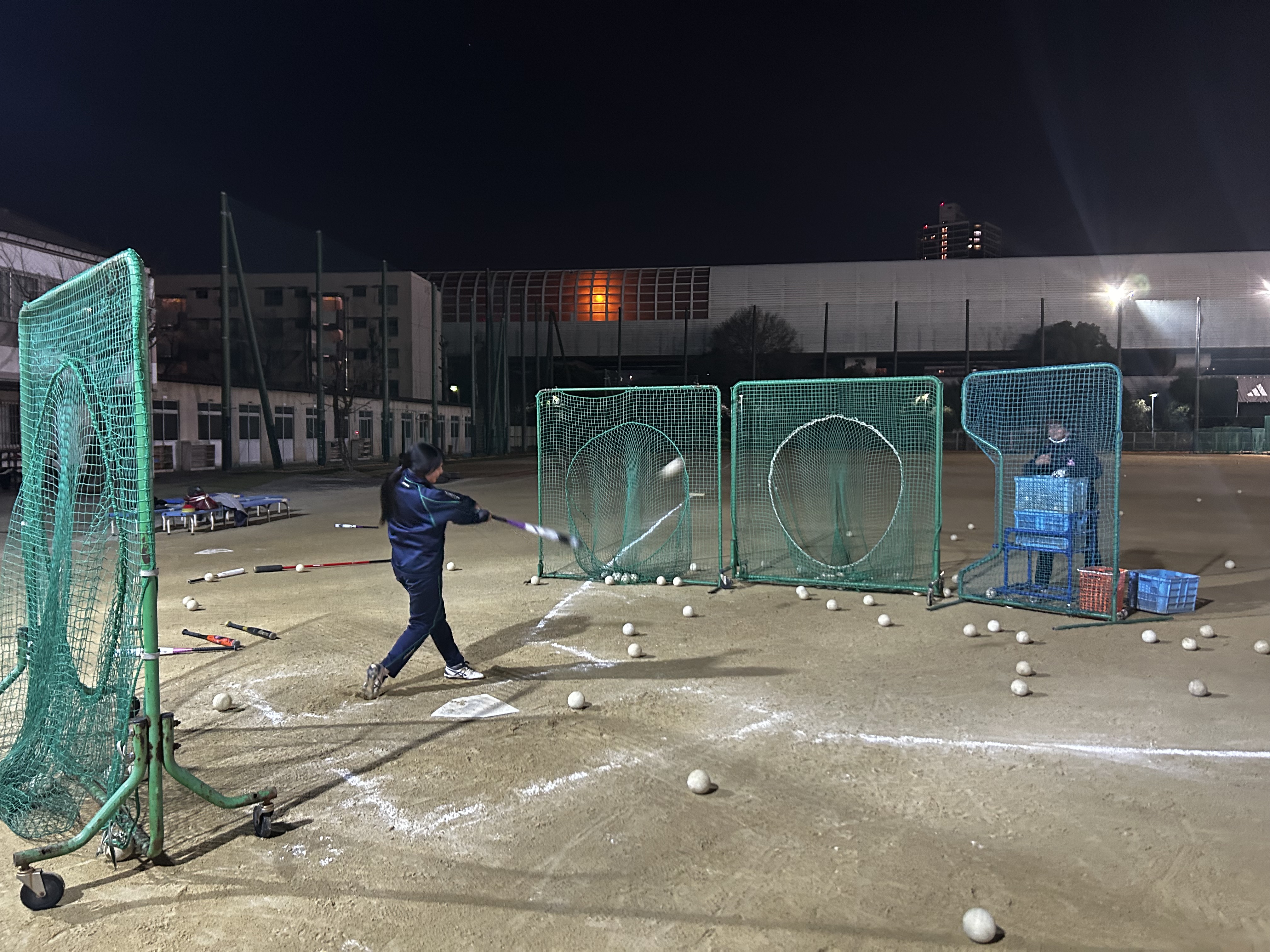 冬は暗くなるのが早いのですが、ソフトボール部はナイター照明のもと、夏と変わらず18時半まで練習できます。冬は基礎練習が多いのですが、たくさんノックを受けて守備がメキメキと上達し、たくさん打ち込みをして打球速度が明らかに変わってきました。写真は今日の打ち込みの様子です。春からの本格的な試合が楽しみです。